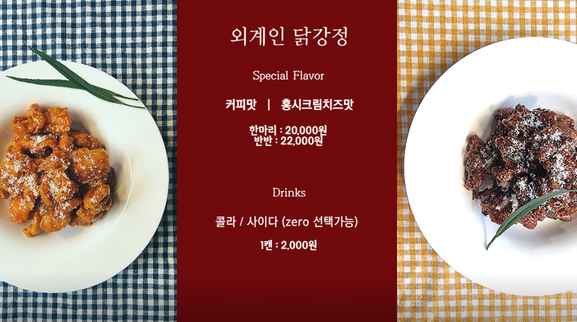 - 설명: 에스프레소로 닭강정의 느끼함을 잡아주어, 커피를 마신 것 같은 쌉싸름한 개운한 맛을 느낄 수 있는 특별한 매운맛 닭강정입니다.