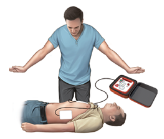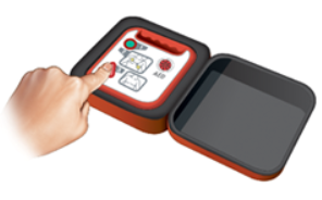 심장충격기(자동제세동기) 전원 켜기 심장충격기(자동제세동기)는 반응과 정상적인 호흡이 없는 심정지 환자에게만 사용해야 하며, 심폐소생술 시행 중에 심장충격기(자동제세동기)가 도착하면 지체 없이 적용해야 합니다. 먼저 심장충격기(자동제세동기)를 심폐소생술에 방해가 되지 않는 위치에 놓은 뒤에 전원 버튼을 누릅니다.