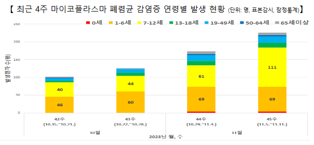 지난달 15일부터 이번 달 11일까지의 4주간 입원 환자 수는 627명으로, 지난 해 같은 기간보다 196명 더 많은 상황입니다. 이 중 226명의 입원 환자 중 180명이 1~12세에 집중돼 있습니다. 마이코플라스마 폐렴균 감염증은 급성 호흡기 감염증으로 제4급 법정 감염병으로 분류됩니다.