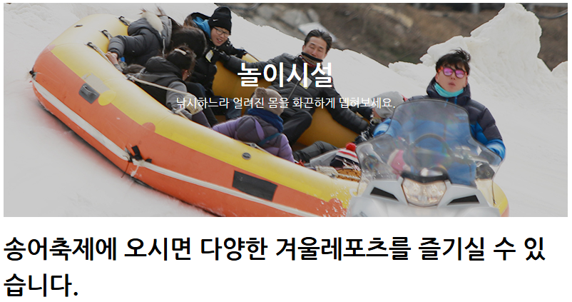 송어 낚시 후 얼었던 몸과 지친 마음을 화끈하게 녹여줄 다양한 놀이시설이 준비되어 있습니다. 아이들과 함께 방문한 가족, 혹은 낚시에 잠시 지친 방문객들은 눈썰매, 얼음 썰매 등 겨울 레포츠를 통해 색다른 즐거움을 만끽할 수 있습니다. 짜릿한 놀이기구와 신나는 겨울놀이가 어우러져 축제의 기쁨을 두 배로 만들어 드립니다.