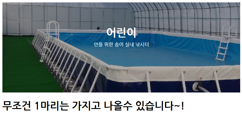 어린이 낚시터 | 20,000원 | 실내 낚시터, 낚시대 대여 (찌낚시), 보호자 동반 (1인 1명) 입장 | 7세~초등학생 대상 |
