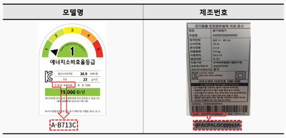 모델명은 에너지소비효율등급 라벨을 통해, 제조번호(시리얼번호, Serial NO, S/N, 일련번호)는 명판사진을 통해 확인이 가능합니다. 라벨, 명판 위치 확인방법 : 고효율가전 홈페이지 - 사업안내 - 라벨 및 명판위치 안내 - 품목 선택