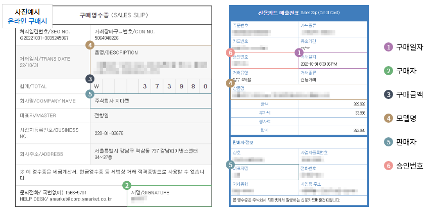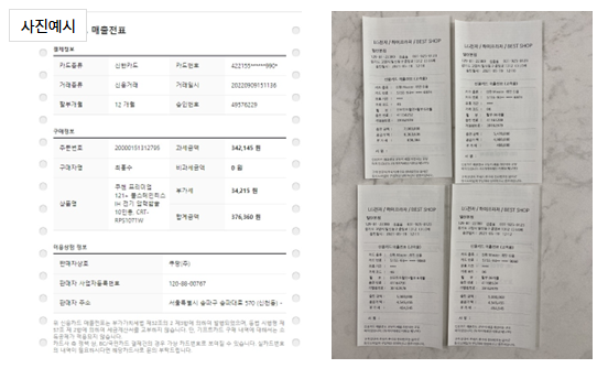 영수증은 구매금액, 구매일시, 승인번호, 구매매장명(사업자번호)포함 결제 방법에 따라 승인번호가 있는 신용카드매출전표, 현금영수증 제출