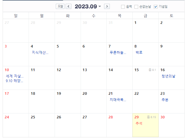 그러나, 희망을 건다면 10월 3일(수) 개천절이 공휴일이니 중간에 낀 10월 2일을 임시 공휴일로 지정해 준다면 추석 연휴를 6일간 보낼 수 있겠죠.